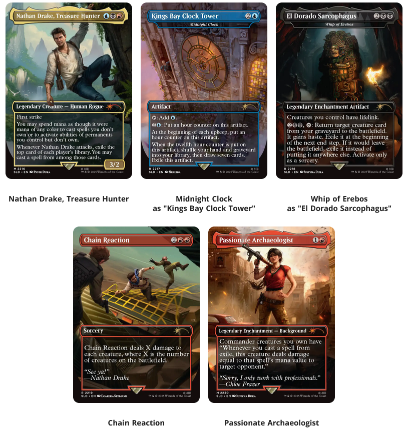 For these three lairs, we’re looking at $30/$40 like usual but there’s also some $60 confetti foils, which are probably the same treatment that the Enchanted Tales subset had back in Wilds of Eldraine. It’s a fun treatment, especially on cards like these, but there are still lots of confetti foils that are inexpensive. That subset also had anime art, which Magic players tend to love. I’m not sold on confetti alone being a reason to buy in.