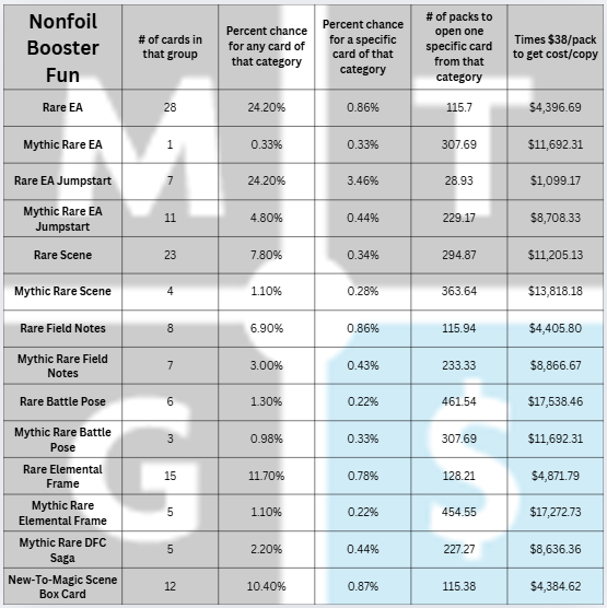 Why am I skipping Play Boosters? Mainly because your odds are much worse than terrible. The wildcard slot in a play booster is 97.6% to give you a main-set nonfoil common, uncommon, rare, or mythic, making everything in a special frame less than 1%. In the actual rare/mythic slot, you’re 92.6% to get a nonfoil rare/mythic from the main set, leaving every variant crammed into that leftover 7.4%. And then the foil slot is more than half commons, with 98.5% of pulls being C/U/R/M from the main set, leaving a mere 1.5% of foils to be anything Booster Fun. That means in 200 packs, you’ll get three Booster Fun foils! Ugh. You might open one, and I hope you understand what incredible odds you beat to do so.