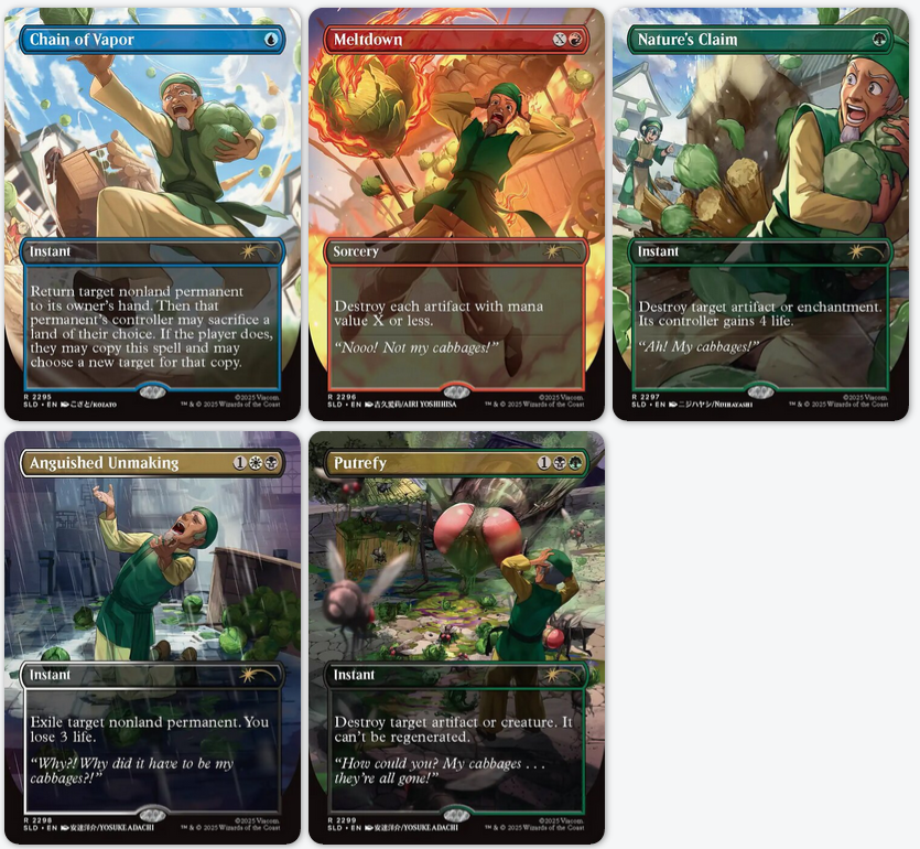 These are hilarious art, and we know that memes have their own value with Commander players. The big unknown here is Chain of Vapor, as the only two foils are the hard-to-pull MYB version and the ‘never-any-around’ original pack foil. The other cards will be lucky to hit $5 here. I like the art, and the setup, but we have data to show that these four cards don’t have high-priced versions.