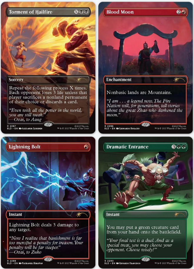 One great, one pretty good, one super-common, and one no one cares about. The Torment will likely be in the $20-$25 range during Dump Week, and the others will be gettable for a lot less. We got a great version of Torment in the sAnS mErCy drop, but the trolling might have put some folks off. Blood Moon has lots of $10+ versions, and this should join that crew. This is the 13th Secret Lair printing of Bolt, making it third place behind Sol Ring (21) and Command Tower (17). Worth getting at retail.