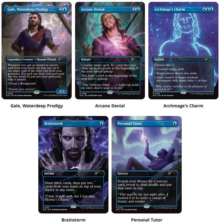I must admit, this feels like a trap. None of these have a combination or popularity and scarce premium version. Brainstorm and Arcane Denial have more than one special version already, so it’s unlikely that price will go wild. The other three cards just don’t have a case for their usefulness. This doesn’t feel like Astarion or Karlach, both in value or in how horny the art is.