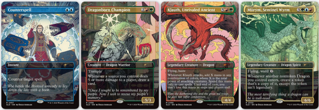 Now this is a Secret Lair. Mirrym is one of blessed few Dragons who can make a case for being the Commander over The Ur-Dragon (though according to EDHREC, it’s not really close, around 2x as many decks as Miirym) and Klauth is one of the biggest swings you can do. There are many games where I’ve laid Klauth down, attacked for 10+ damage, and played out some big Dragons. The Champion is pretty impressive, but really defines ‘win more’, since if you’re smashing for 5, do you really need more cards? And then randomly we have a Counterspell, which is in all the decks with all the versions. Great Lair, I’ll be maxing this out.