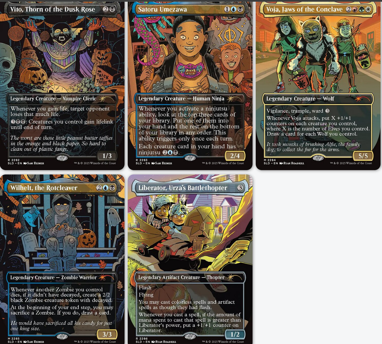 This drop has the bonus pricing of $40 nonfoil/$50 rainbow foil, and that makes it a big iffy for me. I like the cards, I think Jaws is a neat commander to build around, especially because any player can trigger the ability, but none of these stand out as mega-value cards. I’d rather pick up the singles when people are dumping these early on.