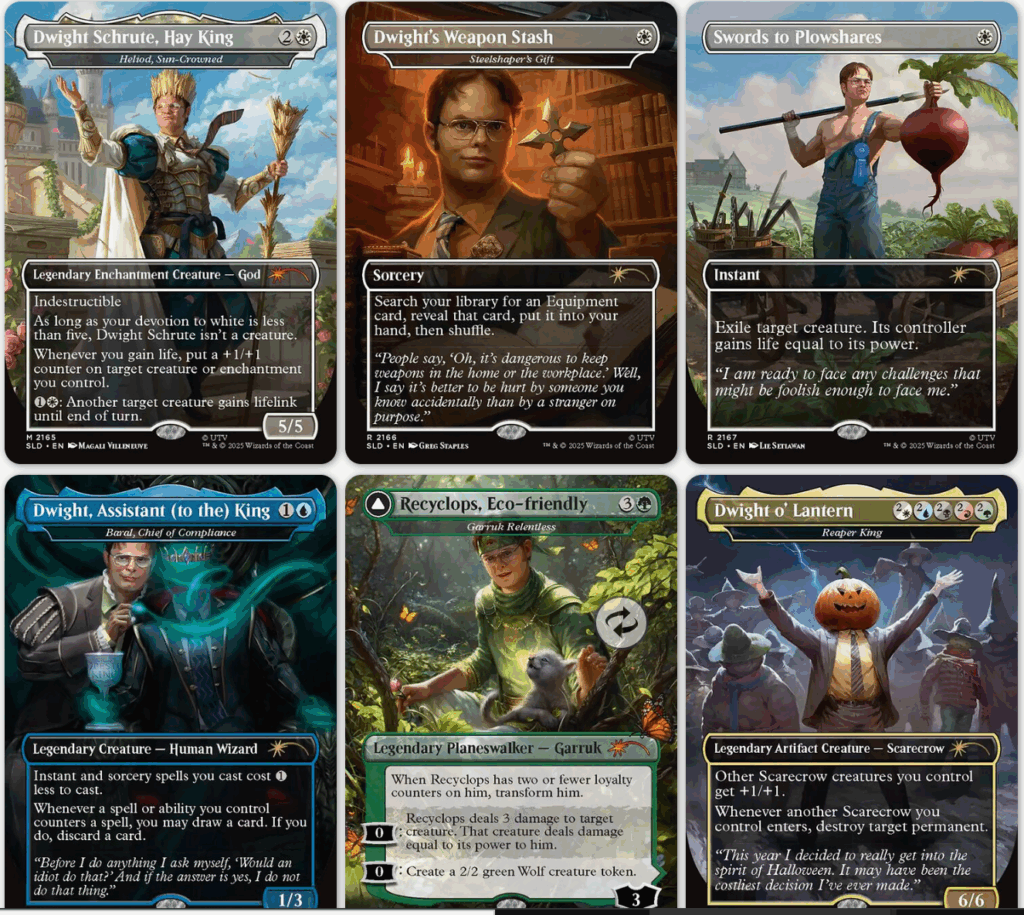 The cards here add up decently, but this is an odd choice, given that The Office ended twelve years ago and its peak was several years earlier. Should be an okay drop, but I don’t think the meme-ness of this will increase value like Princess Bride or Monty Python have done. Worth noting that if they preview some more Scarecrows in Lorwyn Eclipsed, I’ll likely buy a lot of very cheap Reaper Kings.