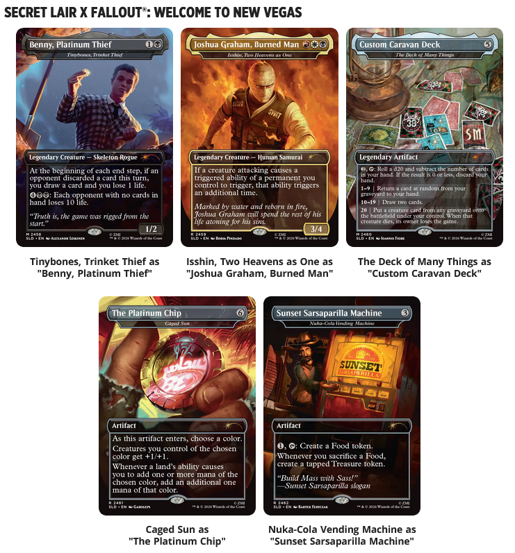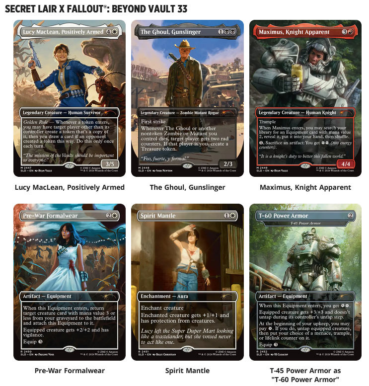 This is the second Fallout Secret Lair drop and it’s timed to come out a little after Fallout’s second season has aired, so we’re getting some new cards, some awesome reprints, and a little something for everyone.